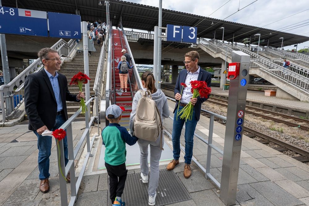 Oberbürgermeister Martin Horn, Staatssekretärin Elke Zimmer sowie die Vorstände der Freiburger Verkehrs-AG, Oliver Benz und Stephan Bartosch, weihten die neue Rolltreppe ein und begrüßten die ersten Fahrgäste zur Eröffnung mit Blumen.