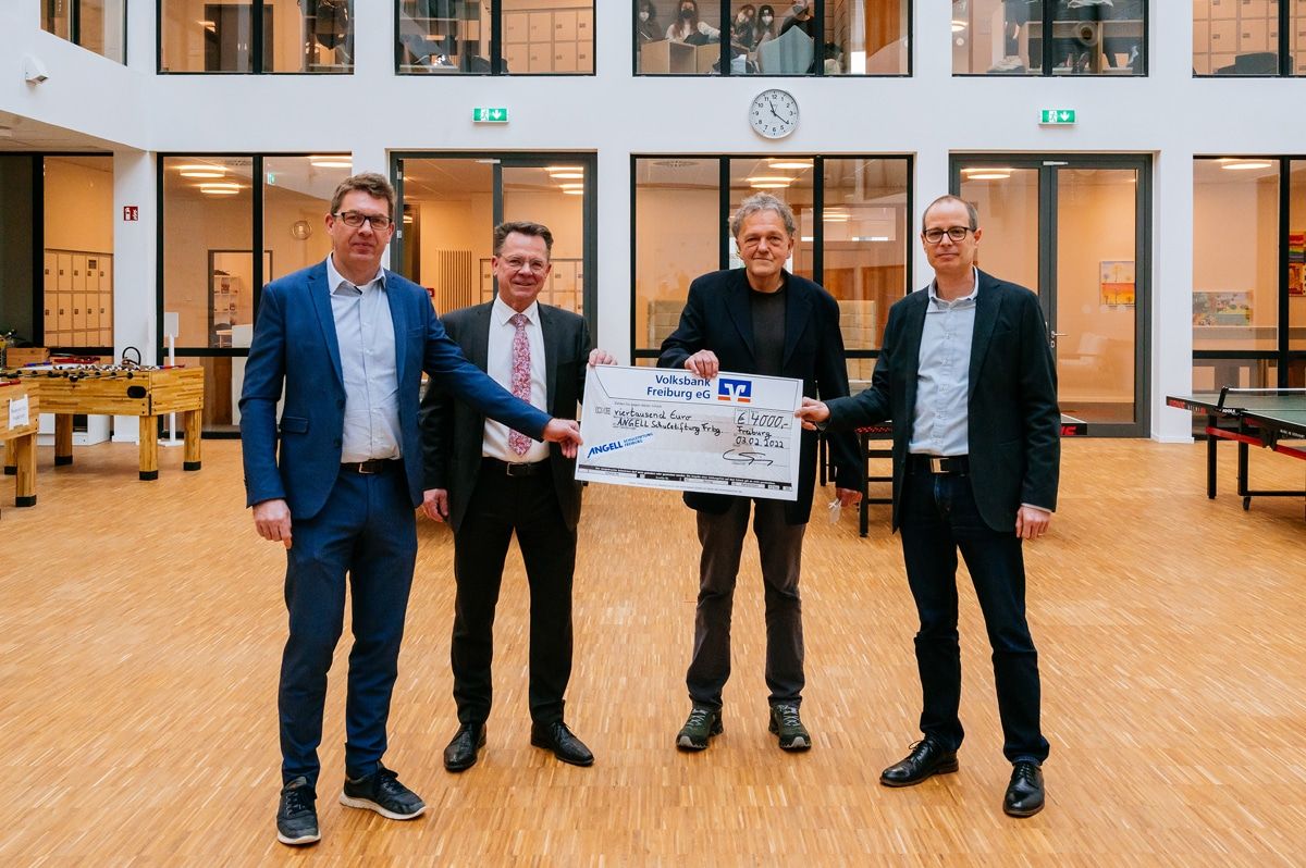 Spendenübergabe im Montessori Zentrum ANGELL (v.l.n.r.): Alexander Hochsprung, Geschäftsführer Montessori Zentrum ANGELL; Volker Spietenborg, Vorstand Volksbank Freiburg; Dr. Bernhard Domke, Vorstandsvorsitzender ANGELL Schulstiftung und Michael Keller Geschäftsführer, Montessori Zentrum ANGELL