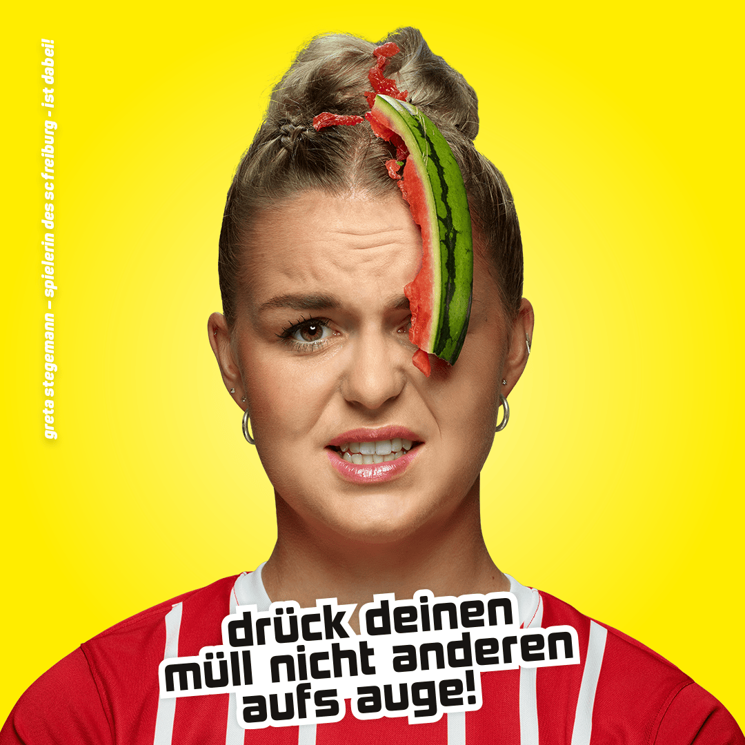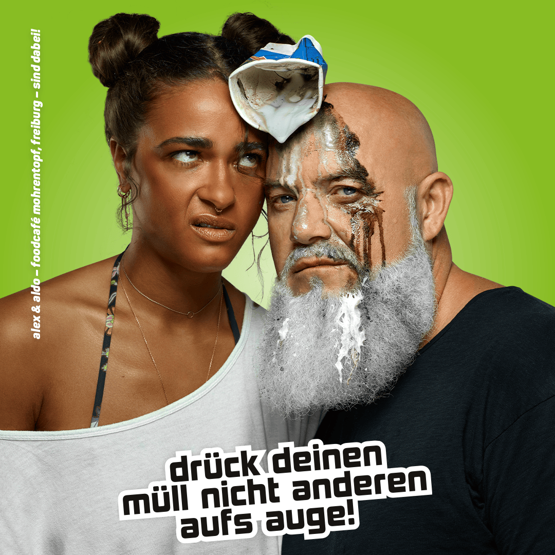 Die neueste Aktion: Prominente Gesichter der Stadt machen sich im Rahmen einer Plakatkampagne für ein sauberes Freiburg stark. Neben Obermeister Martin Horn konnten acht weitere Freiburger Persönlichkeiten für die etwas provokanten Darstellungen gewonnen werden. Darunter etwa die SC Freiburg-Spielerin Greta Stegemann, Schwarzwald-Dragqueen Fräulein Betty BBQ, HipHop-Band Zweierpasch, Radrennfahrer Simon Geschke und Influencer Hamudi. Vom 11. bis 17. Oktober, werden ihre Plakate an VAG-Haltestellen im Stadtgebiet sichtbar sein und mit der Botschaft „drück deinen Müll nicht anderen aufs Auge!“ für mehr Verantwortung werben. In den Gesichtern sind die ProblemMüllarten drapiert, die maßgeblich für die Verschmutzung 2 öffentlicher Flächen sorgen – vom Einweg-Kaffeebecher, über die Bananenschale bis zum Pizzakarton.