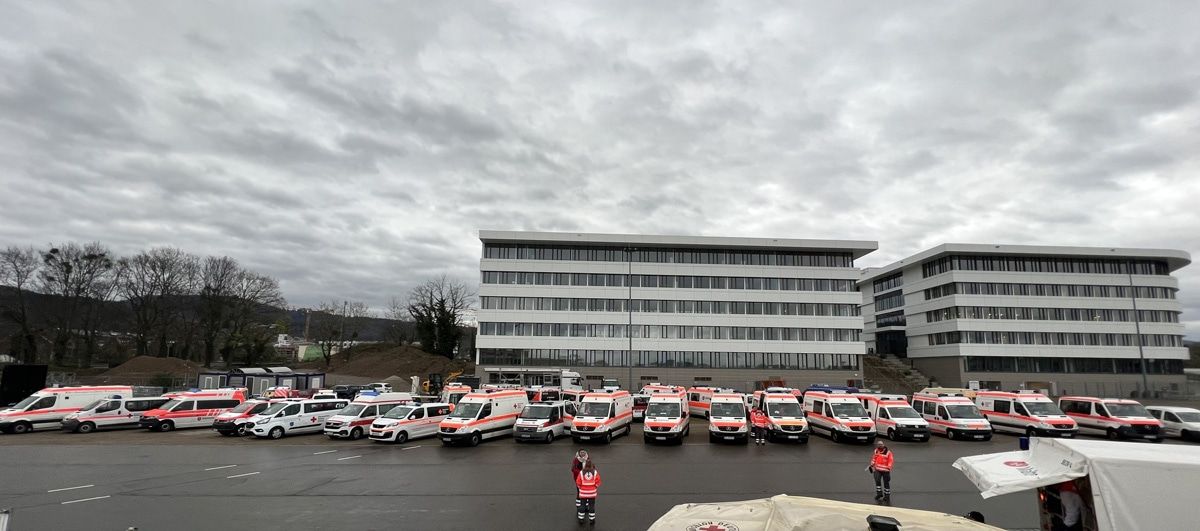 Einen Blick auf den Zielbereich und die Einsatzfahrzeuge der Hilfsorganisationen.
