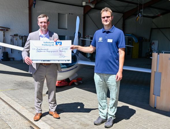 Mit einer Spende von 2.000 Euro unterstützt die Volksbank Freiburg die Akademische Fliegergruppe (Akaflieg) bei der Anschaffung eines innovativen Elektroflugzeugs.