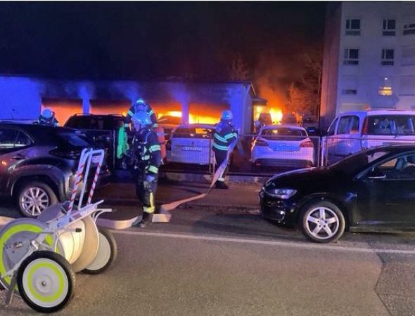 Brennende Fahrzeuge auf Parkplatz des Malteser Hilfsdienstes