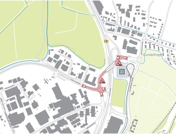 Vollsperrung der Kreuzung Mooswaldallee/Hans-Bunte-Straße sowie Anschluss Gundelfingen Süd