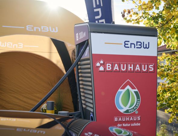 BAUHAUS und die EnBW bauen eine gemeinsame Schnellladeinfrastruktur auf // Der Standort Freiburg im Breisgau ist eines von über 100 BAUHAUS Fachcentren, das die beiden Partner mit Hochgeschwindigkeits-Ladepunk…
