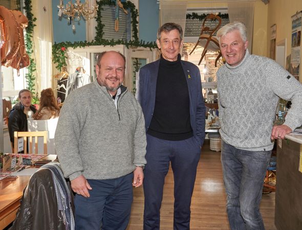 Vor Weihnachten trafen sich im dem S’Einlädele angeschlossenen „Café Satz“ Volker Höhlein, Geschäftsführer der S’Einlädele gGmbH, und Hans-Peter Fischer aus der Ukraine-Hilfe des S’Einlädele mit dem Bundestags…