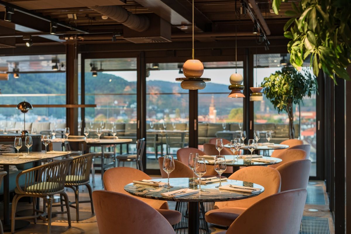 Seit Anfang Oktober empfängt Betriebsleiter Marc Hübner und sein Team die Gäste in einem Restaurant, das die schönsten Seiten Heidelbergs von oben zeigt und gastronomisch frischen Wind in die Region bringt. Mit rund 110 Plätzen im Innenbereich und weiteren 120 Plätzen im Außenbereich eignet sich die Location ebenfalls ideal für Veranstaltungen jeglicher Art für bis zu 200 Personen. „Ob Hochzeitsfeiern, Empfänge oder Firmen-Events, all das ist hier oben über den Dächern der Stadt möglich. Wir wünschen uns einen lebendigen Ort, der wandelbar vielerlei Wünsche bedient“, sagt Schmidt.