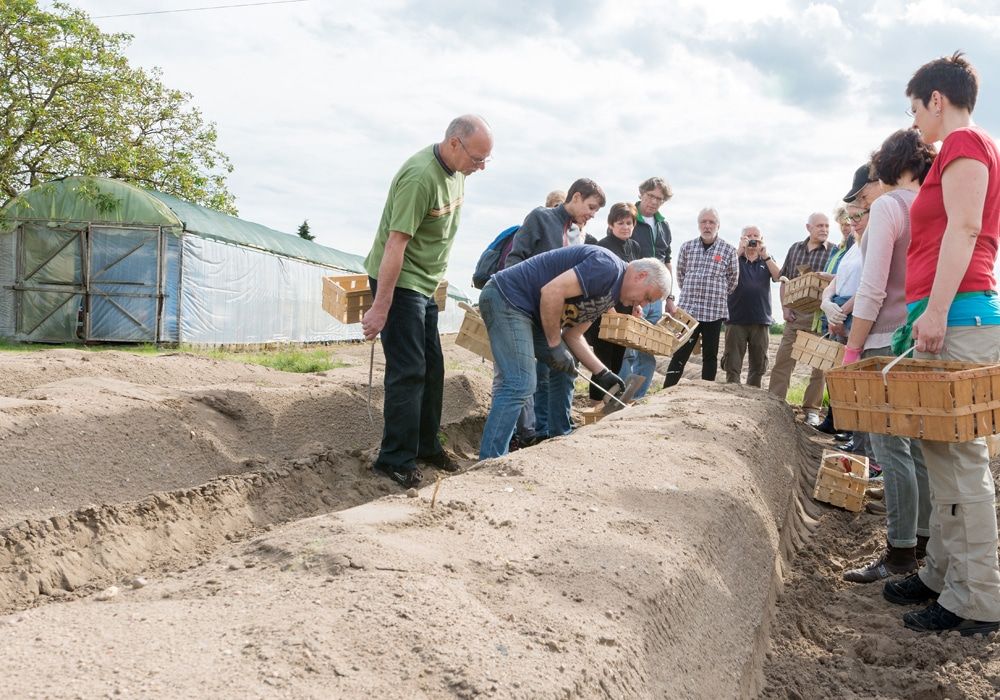 Unter sachkundiger Anleitung der jeweiligen Spargelhofbesitzer lernen die Teilnehmer:innen alles über den Anbau des königlichen Gemüses. Auf dem Feld wird zunächst gezeigt, wie Spargel mit dem passenden Werkzeug richtig gestochen wird. Anschließend dürfen alle selbst zum Spargelwerkzeug greifen – und ihren Ertrag natürlich mit nach Hause nehmen.