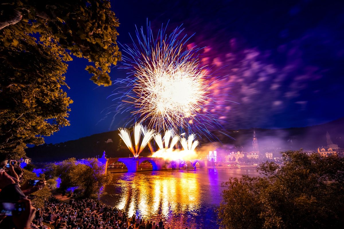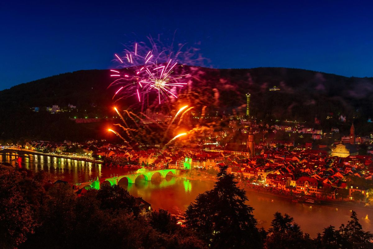Wenn das Wahrzeichen langsam verblasst, beginnt das Feuerwerks-Spektakel über der Alten Brücke – eingeführt von Kurfürst Friedrich V., der seine frisch vermählte Frau, Englands geliebte Prinzessin Elisabeth Stuart, mit einem damals einzigartigen Fluss-Feuerwerk in Heidelberg begrüßte. Einen hervorragenden Blick auf das Ereignis garantieren das nördliche Neckarufer, der Philosophenweg sowie die Scheffelterrasse im Schlossgarten.