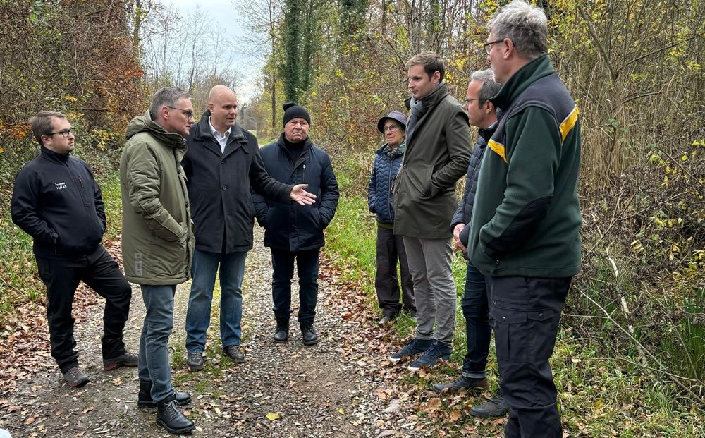 Haser, Mitglied im Landtagsausschuss für Umwelt, Klima und Energiewirtschaft und Sprecher der CDU-Fraktion zu ebendiesem Thema ist auf Einladung von Bury aus Oberschwaben an den Rhein gekommen. Auch die Bürgermeister von Weisweil und Wyhl nahmen an der Begehung teil. Wie die Gemeinde Rheinhausen, sind sie Mitglied in der Bürgerinitiative „Polder Wyhl/Weisweil so nitt“. Die Initiative eint ein gemeinsames Anliegen: „Wir sind gegen die ökologischen Flutungen, weil die nicht nur den Wald, sondern auch uns kaputtmachen“ so Louis. Durch die Flutungen soll der Wald an notwenige Flutungen zum Hochwasserschutz im integrierten Rheinprogramm, angepasst werden. Wieso sie die künstlichen Flutungen ablehnen, zeigten die Bürgermeister den Abgeordneten bei der Begehung im Rheinwald. Den Wald „anpassen“ bedeutet, dass Flora und Fauna absterben, die die künstliche Flutung nicht überleben. Dabei stellten die Bürgermeister in Frage, ob ein umgebauter Wald in Folge des Klimawandels und niedrigen Rheinständen, überhaupt jedes Jahr geflutet werden kann und dann nicht Gefahr laufen würde auszutrocknen. Ein weiteres Problem geht aus der Historie und der Nähe zu Frankreich hervor. Der ganze Wald ist durchzogen von alten Schützengräben und Einschlagkratern, wie Vertreter der Bürgerinitiative zeigten. Nach den Flutungen würden so zahlreiche Tümpel zurückbleiben. Ideales Brutgebiet für einheimische Schnaken und eingeschleppte Tigermücken. Die Argumentationsliste der Initiative geht weiter, über eingespültes Mikroplastik, voll laufende Keller und verunreinigtes Grundwasser. Den Abgeordneten wurde aber auch ein Gegenvorschlag präsentiert: Im Wald besteht ein weit verzweigtes Schlutennetz, Relikte des Altrheins vor der Tullabegradigung. Diese könnte man ertüchtigen, verbinden und den Wald so schonend an das Wasser gewöhnen.