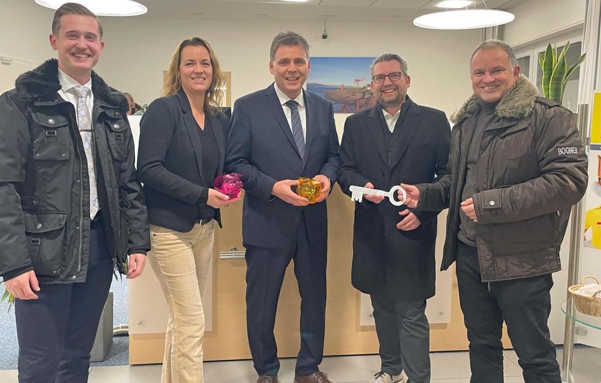 In den Räumen der Raiffeisenbank im Breisgau eG in Sasbach am Kaiserstuhl, hier von links bei der offiziellen Eröffnung: v.l: Erik Daniel, Anne Hinterberger, Holger Baptist, Bankvorstand Andreas Binninger und Bürgermeister Jürgen Scheiding bei der „Schlüsselübergabe“.