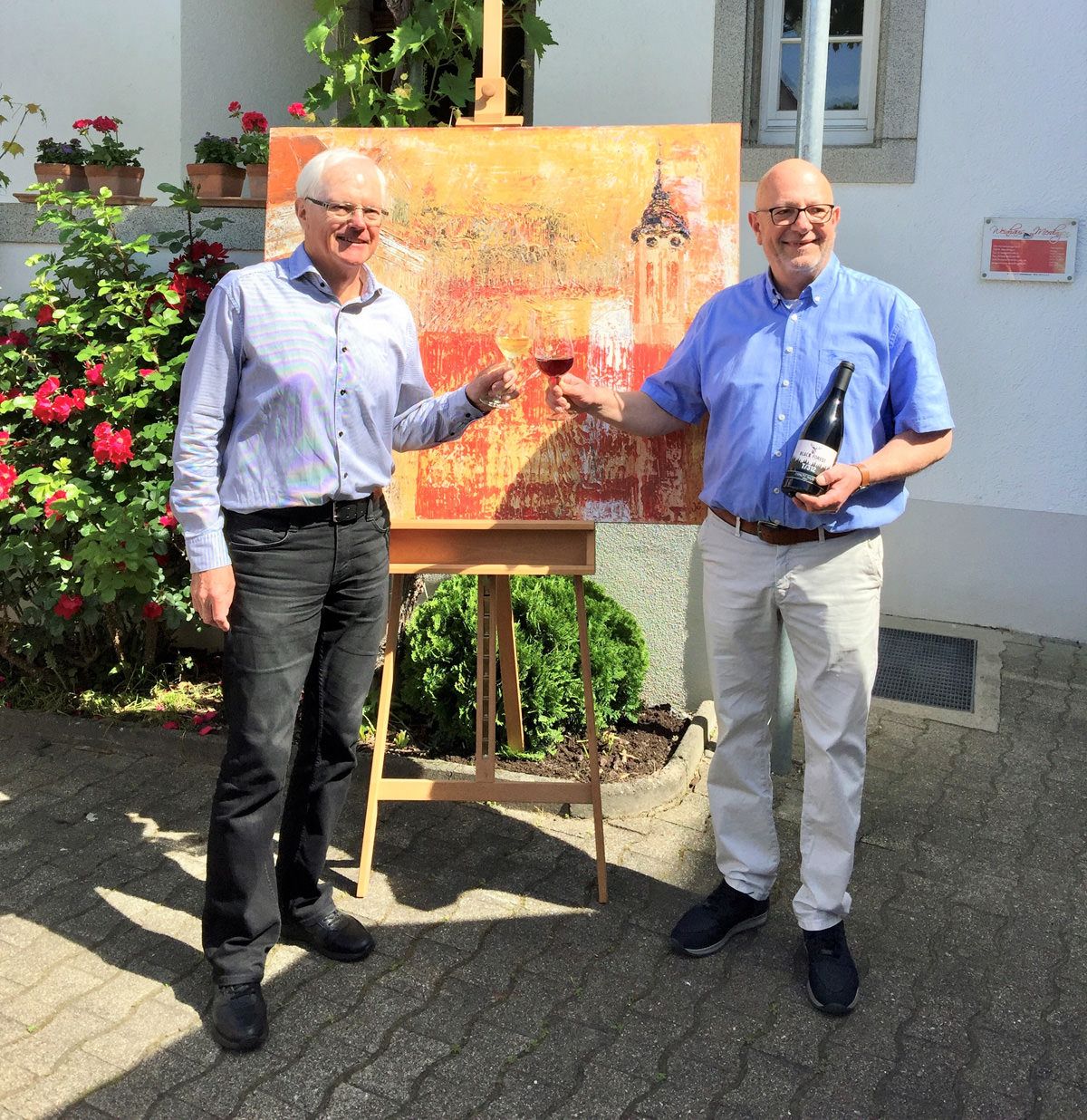 Unter Nachbarn schwärmten Eckart Escher und Henning Johanßen über ihre Weinregion und erinnerten an die Vernissage von 2017. Zum Gemälde des Merdinger Weinhauses hatte Henning Johanßen damals eine passende „Wortmalerei“ kreiert: „Merdingen. Du bist in aller Munde - weit bekannt. Du bist in bester Lage - die Winzer erzählen es. Du bist Barock - im Schwung des Lebens. Du bist Wein - im Weingarten Freiburgs. Du bist Juwel - am Ort des Genusses. Du bist mein.“ (Jo‘)