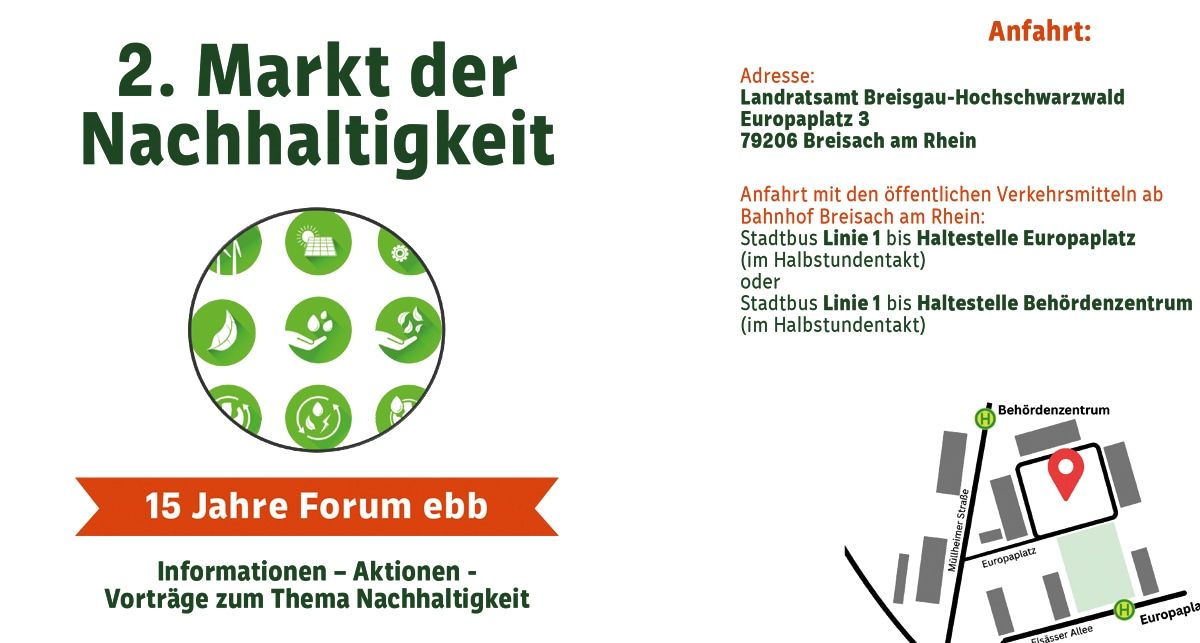 Das Forum ebb lädt am 20. September herzlich zum 15-jährigen Bestehen am Europaplatz in Breisach am Rhein ein. Den Rahmen bildet ein Nachhaltigkeitsmarkt, der bereits zum zweiten Male wiederholt wird.