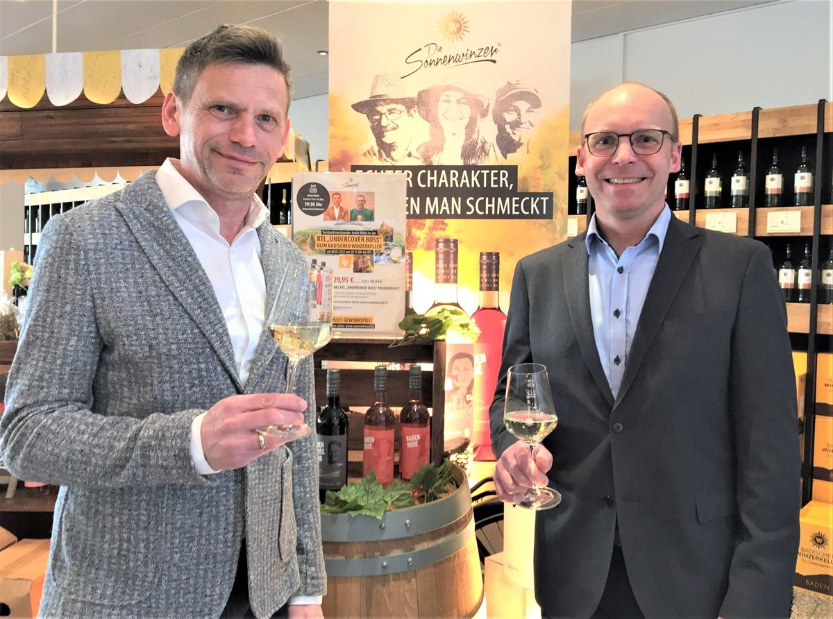 Prosit auf die Frühjahrssaison 2022 - André Weltz (l) und Christian Schätzle (r) mit Sonnenwinzerwein und der Sonne im Glas