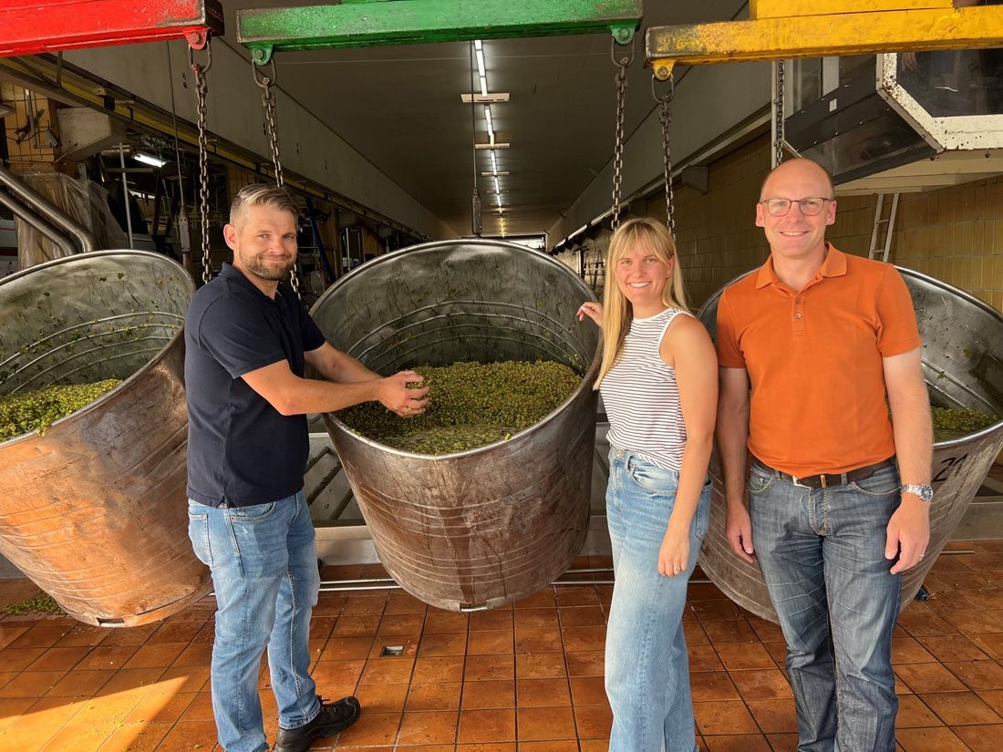 Start der Weinlese bei den Sonnenwinzern 03.09.24 – Heute geht es los mit dem Tanz der Bottiche an der Traubenannahmestation im Badischen Winzerkeller in Breisach - v.l.n.r.: Leitender Kellermeister Manuel Mößner, Lea Tritschler, Leiterin Unternehmens-, Business- und Markenentwicklung und Christian Schätzle, Vorstand Produktion / Oenologie. Aus den heutigen Anlieferungen der Frühsorten Solaris und Müller-Thurgau gibt es in den nächsten Tagen unseren leckeren Federweißer.