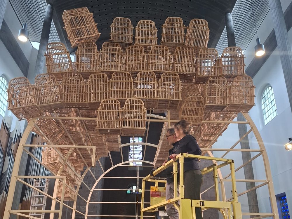 10 Bankreihen mussten der raumgreifenden Kunstinstallation des in Karlsruhe lebenden irakischen Künstlers Fahar Al-Salih weichen. Seit Montag ist der Blick auf den Altar der Ev. Stadtkirche Karlsruhe wieder frei. THE CAGE hat vom 7. bis 29. März 2026 sowohl gesellschaftliche wie individuelle Themen eröffnet und über das kulturelle und pädagogische Begleitprogramm ein breites Publikum erreicht. Das Publikum konnte über 30 Events vor der Kulisse der raumgreifenden Installation erleben, darunter 4 thematische Gottesdienste, 3 öffentliche Führungen und weitere Führungen angemeldeter Gruppen mit Künstlergesprächen, 5 Talks, Dialogveranstaltungen und Podiumsdiskussionen, 11 Konzerte, 2 Lesungen und einen Poetry Slam.