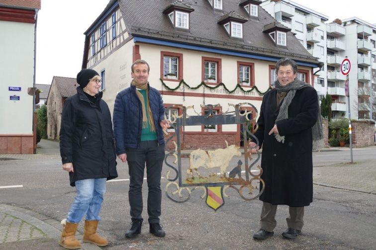 Zum Abschied überreichen Anita und Gerard Jollit das Wirtshausschild vom Durlacher Gourmettempel „Zum Ochsen“ samt ornamentverziertem Ausleger (Tragestange nicht im Bild) vor der traditionsreichen Gaststätte an Ferdinand Leikam (Bildmitte), Leiter Historische Museen in Karlsruhe.
