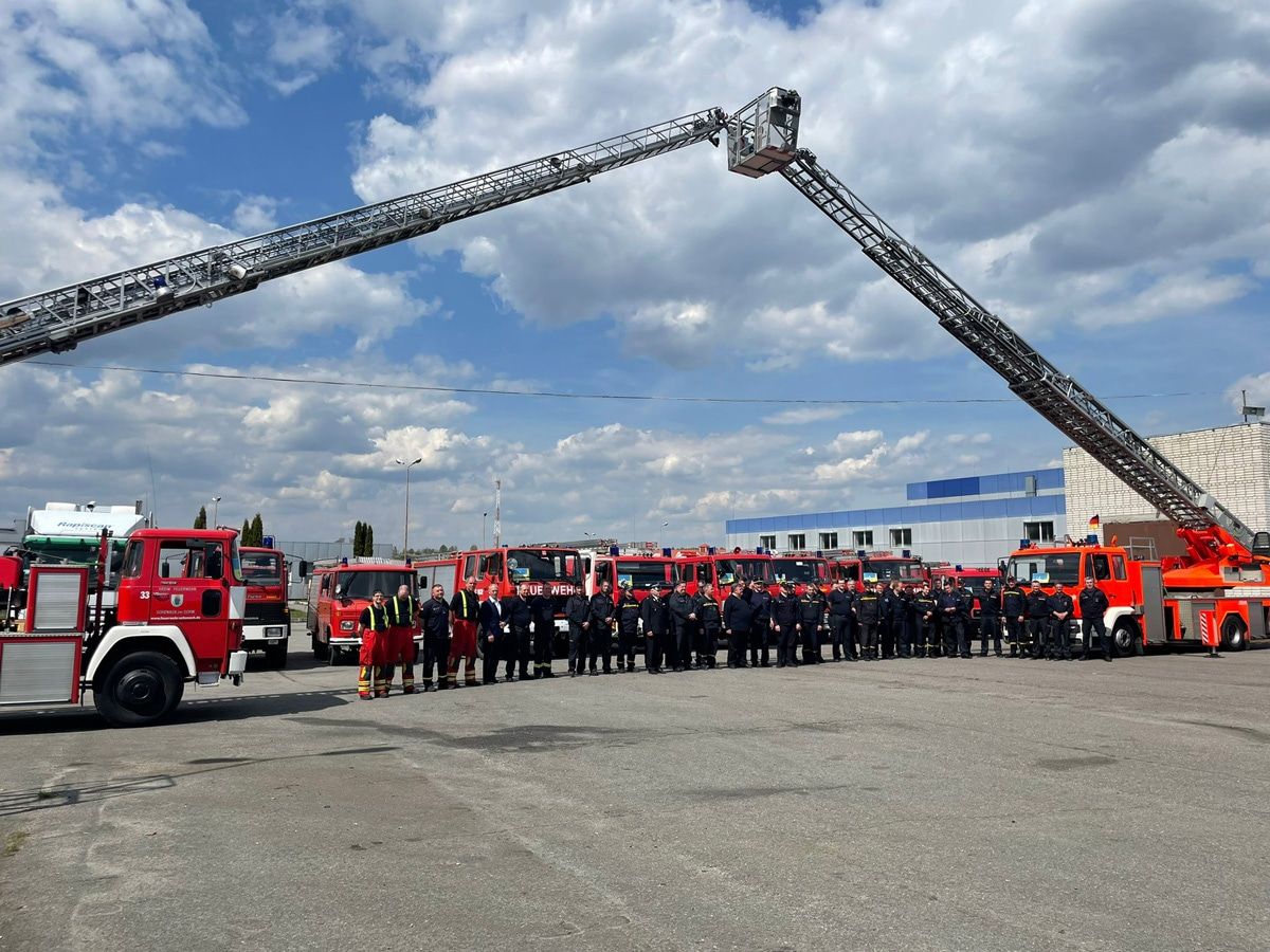 Die Feuerwehrfahrzeuge werden den ukrainischen Einsatzkräften übergeben.
