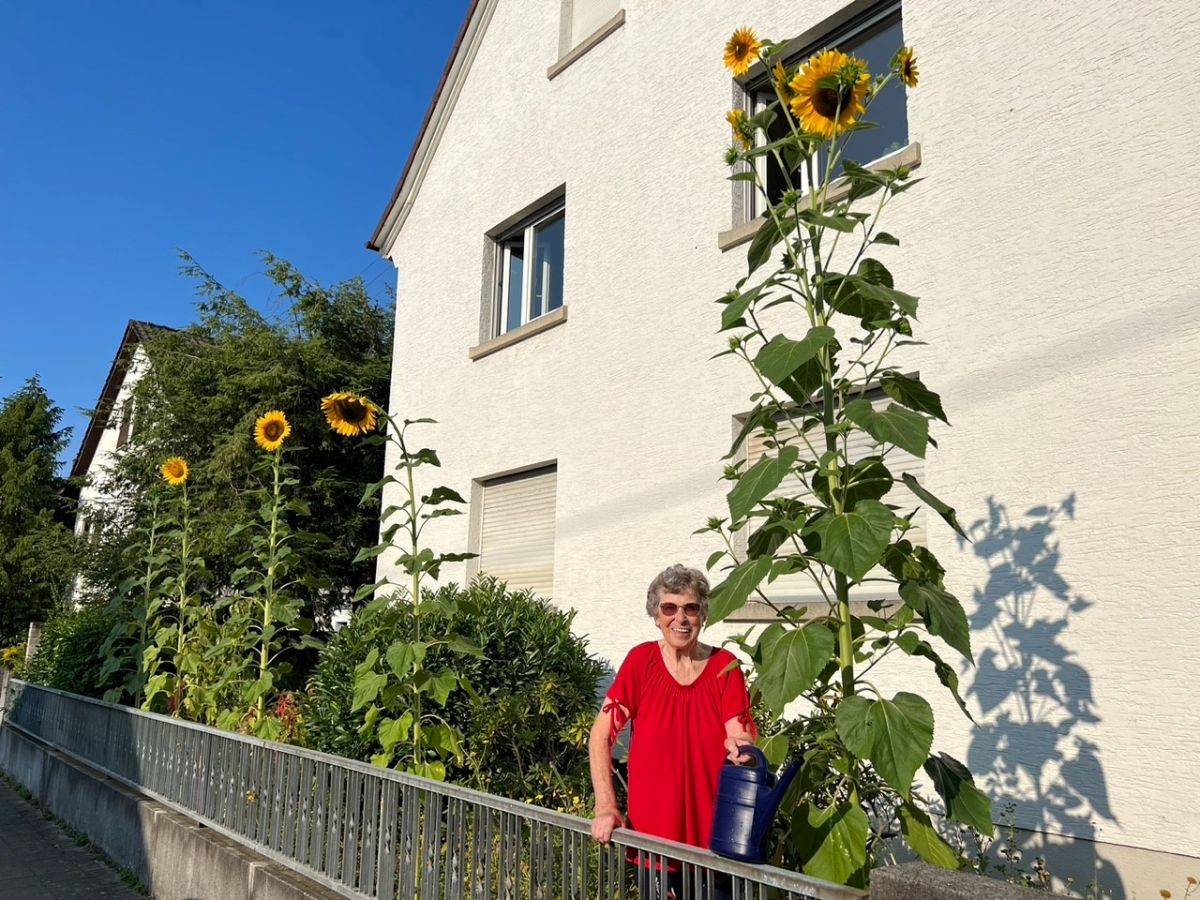 Für ihre stattlichen, über drei Meter hohen Sonnenblumen im Stadtteil Rüppurr ist Hanne Bayerl gerne schon früh morgens mit der Gießkanne unterwegs. „Die haben wir alle aus einzelnen Samenkörnern gezogen“, so der Tenor der rüstigen Rentnerin, die im Vorjahr ihren 90. Geburtstag feiern konnte.