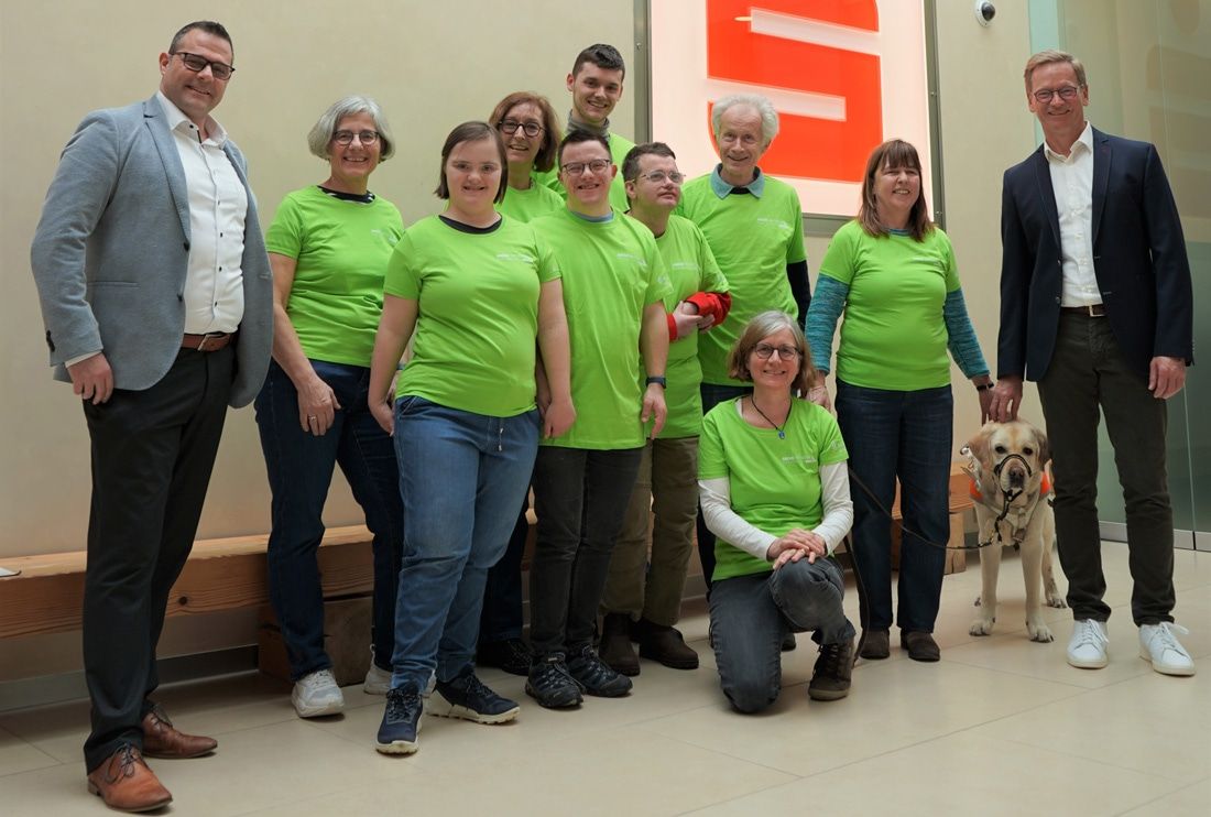 Stiftungsmanager Dominik Lentz (links) und Vorstandsvorsitzender Wolfgang Huber (rechts) der Sparkasse Hanauerland mit dem Team der Arche Initiative und einigen Bewohner