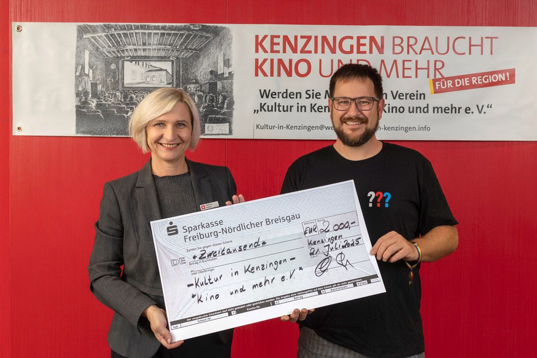 Patricia Haras, Regionalmarktleiterin der Sparkasse Freiburg-Nördlicher Breisgau für Endingen und Kenzingen, übergibt den symbolischen Spendenscheck über 2.000 Euro an Benjamin Kleinstück, Vorstand von "„Kultur in Kenzingen – Kino und mehr e.V."