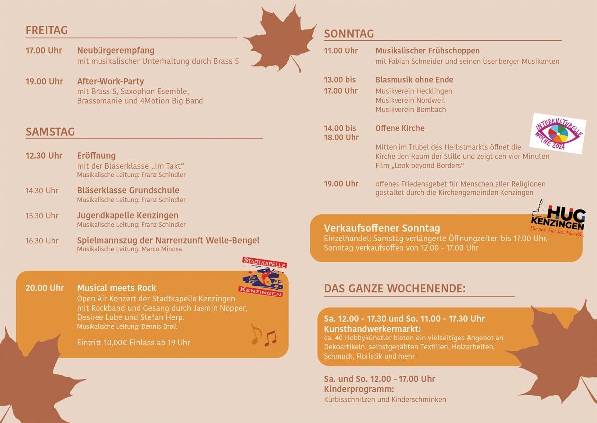 Der Einzelhandel beteiligt sich mit erweiterten Öffnungszeiten am Samstag bis 17:00 Uhr und einem verkaufsoffenen Sonntag von 12:00 bis 17:00 Uhr. Für Kinder gibt es ein spezielles Programm auf dem Rathausparkplatz, wo sie unter anderem mit den städtischen Auszubildenden Kürbisse schnitzen und sich schminken lassen können. Während des Festes wird die Brotstraße von Freitagmorgen bis Montagmittag gesperrt sein, und die Hauptstraße von Freitagmittag bis Sonntagabend. Zusätzlich wird es einen Bücherstand der Katholischen Bücherei St. Laurentius vor Kuri Immobilien geben, anstelle des üblichen Bücherflohmarktes bei der Alten Halle. Im Rahmen der Interkulturellen Woche wird die Kirche am Sonntag für Besucher geöffnet sein. Das Deutsche Rote Kreuz wird am Sonntag einen Sanitätsdienst und einen Informationspavillon bereitstellen. Ein besonderer Dank gilt den Sponsoren des Festes, darunter EDEKA, Freyler, die Sparkasse Nördlicher Breisgau, Himmelsbach Leitern, das Kenzinger Wohnzentrum, die Volksbank Breisgau Nord, das SV Team Allgaier und der Hiss Fachmarkt, deren Unterstützung das Fest erst möglich macht.
