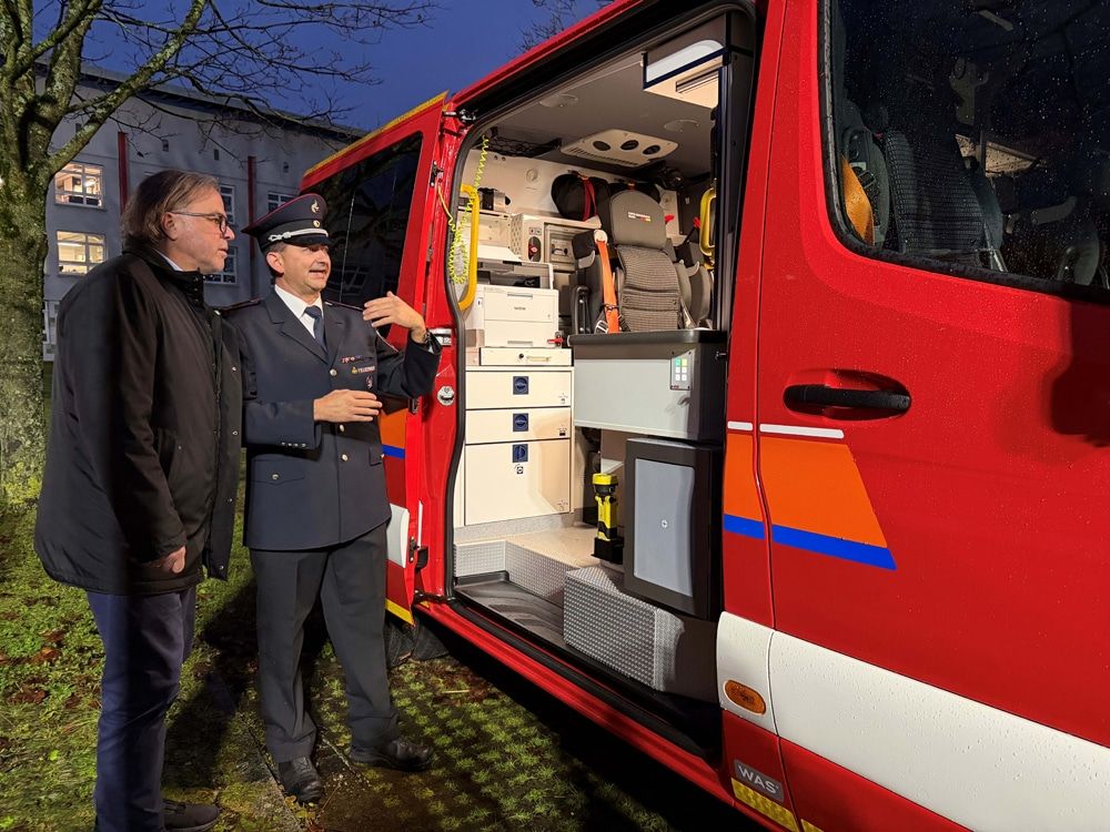 Thomas Meier von der Feuerwehr Kenzingen erklärt Regierungspräsident Carsten Gabbert das neue Einsatzfahrzeug