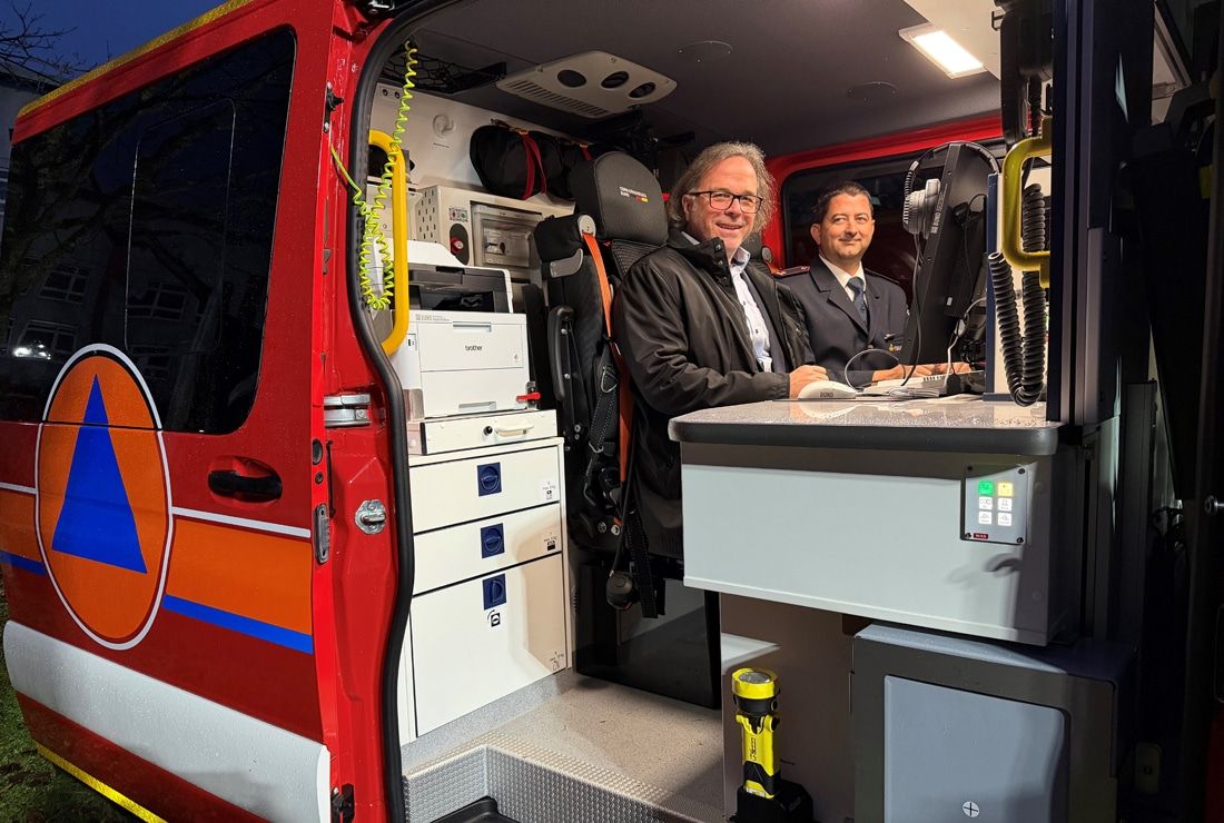 Regierungspräsident Carsten Gabbert und Thomas Maier von der Feuerwehr Kenzingen sitzen in dem neuen CBRN-Erkundungswagen