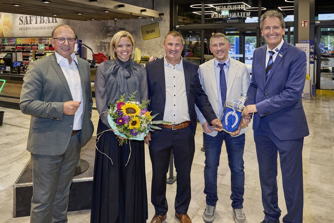 Bereits am Vorabend des Eröffnungstags gaben die Geschäftsführer Susanne Scheck-Reitz (2. v. l.) und Christoph Scheck-Berger (3. v. l.) gemeinsam mit Brühls Bürgermeister Dr. Ralf Göck (5. v. l.), Rainer Huber, Sprecher des Vorstands Edeka Südwest (1. v. l.), sowie Marktleiter Sven Lempke (4. v. l.) im Rahmen einer Feierstunde symbolisch den Startschuss für den neuen Markt.
