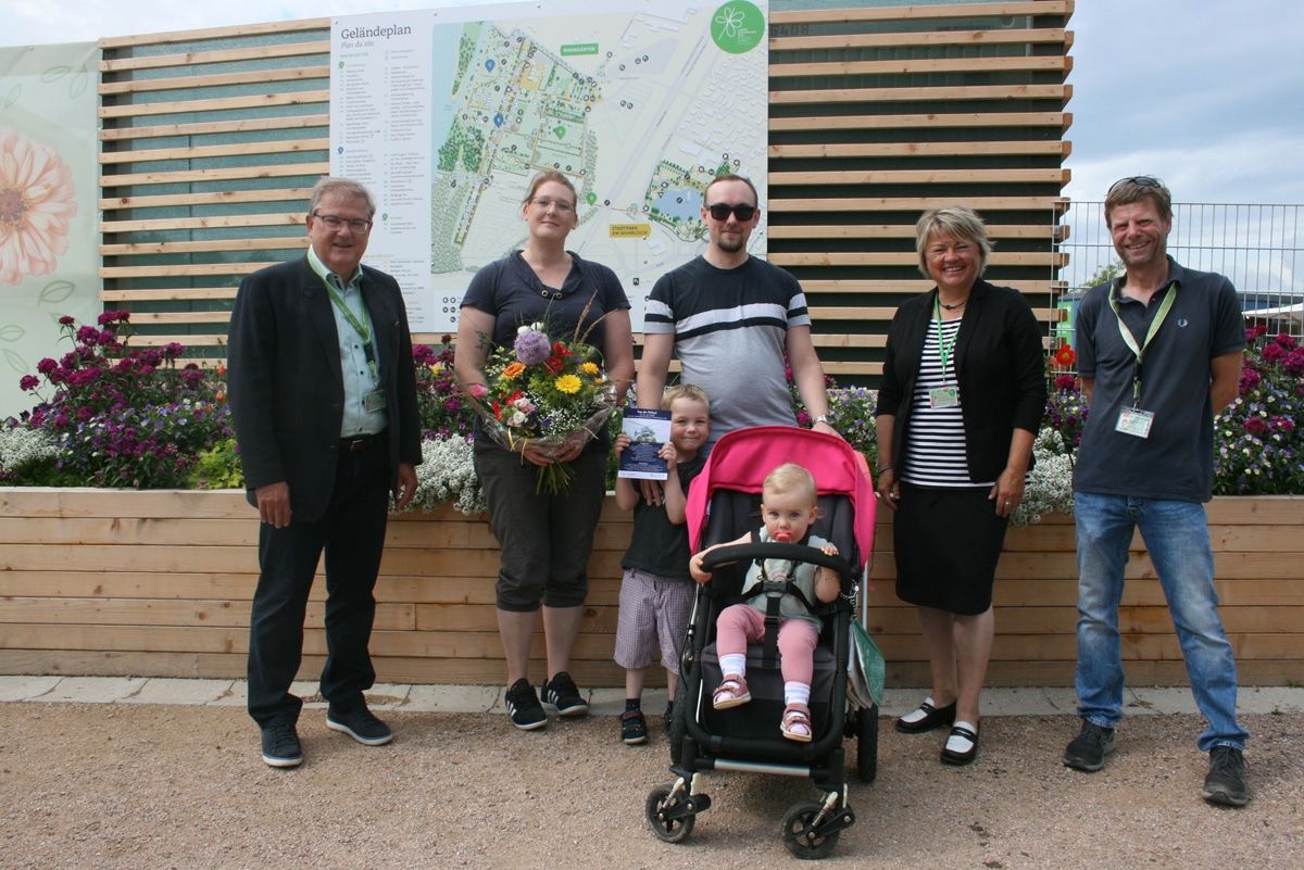 Die Landesgartenschau 2022 Neuenburg am Rhein freut sich über den 100 000 Besucher! Bürgermeister Joachim Schuster und die Landesgartenschaugeschäftsführer Andrea Leisinger und Nils Degen überreichten einer überraschten Janina Strauch aus Neuenburg –Grißheim am Pfingstsonntag einen Blumenstrauß, die gemeinsam mit Mann Thomas und den Kindern Nico und Emma die Landesgartenschau besuchte.