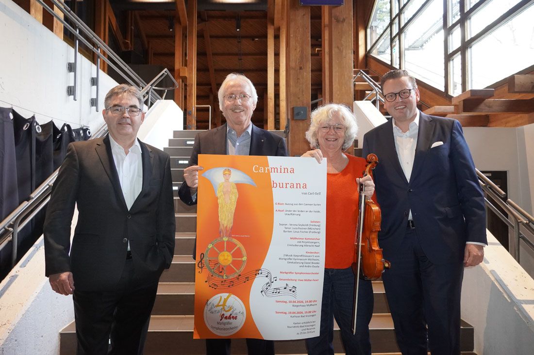 v.l. Norbert Lange, Vorstandsvorsitzender Volksbank Breisgau-Markgräflerland, Uwe Müller-Feser, Dirigent MSO, Kathrin Glüer, Vorstand Öffentlichkeitsarbeit MSO, Stephan Grether, Vorstandsvorsitzender Sparkasse Markgräflerland