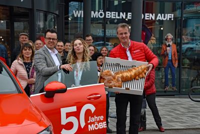 Höhepunkt der Jubiläumsaktion war die Verlosung unter dem Motto „50 Jahre Möbelschau – 50 Gewinner“. Als Hauptpreis wurde ein Mercedes-Benz CLA für ein Jahr übergeben – bereitgestellt vom Autohaus Schmolck. Für große Freude sorgten zudem drei Gutscheine für frei geplante Küchen der Firma Nolte im Wert von jeweils 5.000 Euro, zwei E-Bikes von e-motion e-Bike Welt Freiburg Süd, ein Reisegutschein im Wert von 1.000 Euro von Reiseloft Heitersheim, zehn Mal zwei Eintrittskarten für den Europapark in Rust, Gutscheine der Firma BÖ Schuhe & Fashion, drei Einkaufsgutscheine im Wert von je 400 Euro für die Möbelschau sowie zahlreiche weitere attraktive Preise.