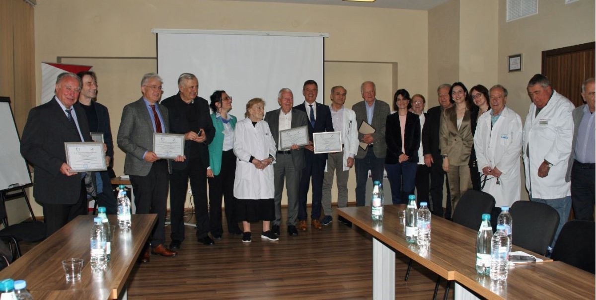 Verbunden mit der Einladung zu einem Gastbesuch war es ein großes Anliegen der Geschäftsleitung des Chapidze Herzzentrums Tiflis, die Personen mit einer besonderen Auszeichnung zu würdigen, die durch ihren zum Teil über Jahrzehnte hinweg erbrachten Beitrag zur überaus erfolgreichen Entwicklung des Herzzentrums beigetragen haben. Im Rahmen einer Feierstunde überreichte der Vorsitzende des Chapidze Herzzentrums und ehemaliger Staatsminister Dr. Avtantil Jorbenadze, die Ehrung an Prof. Dr. Franz Josef Neumann, Bürgermeister Volker Kieber, Dr. Pieter Tollenaere, Dr. Alexander Henning, Werner Tomm und Bernhard Grotz.