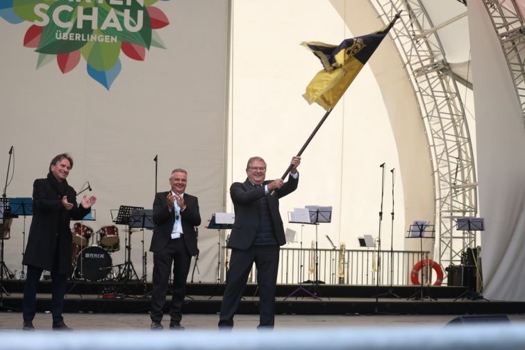 Die offizielle Landesgartenschaufahne wurde von Jan Zeitler (OB Überlin-gen) und Manne Lucha (Minister für Soziales, Gesundheit und Integration) an Joachim Schuster (Bürgermeister Neuenburg am Rhein) übergeben