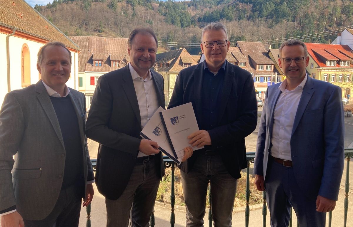 von links nach rechts: Leiter des Kommunalmanagements Jochen Debus, badenovaNETZE Geschäftsführer Reinhold Lohr und Sulzburgs Bürgermeister Dirk Blens, sowie badenova Vorstand Heinz-Werner Hölscher.