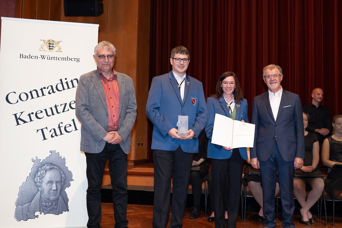 In diesem Jahr wurden 16 Vereine ausgezeichnet - darunter die Stadtmusik Neuenburg 1863 e.V. - Die Vereinsvorstände Daniel Terhardt und Sabrina Kirner konnten die Conradin-Kreutzer-Tafel in Bruchsal aus den Händen von Staatssekretär Arne Braun in Empfang nehmen.