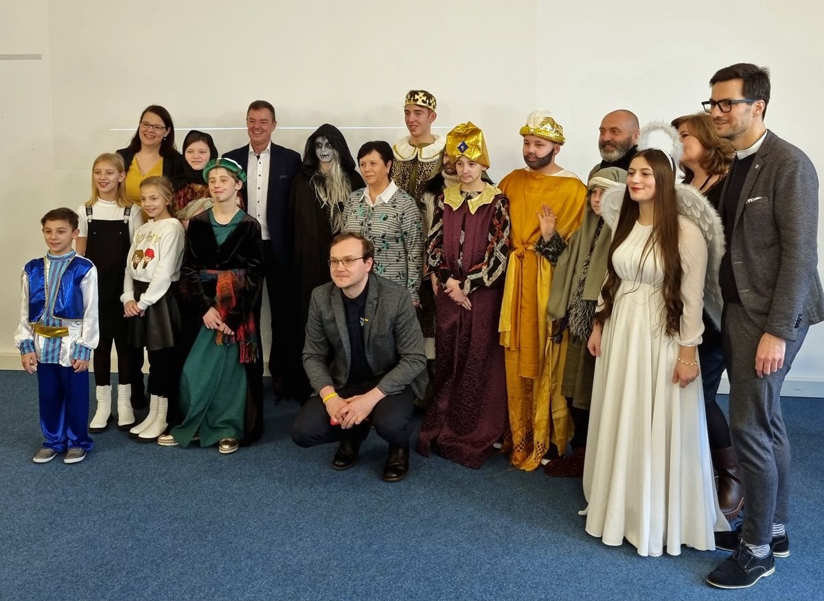 Das Bild zeigt Katja Potzies, Volker Kieber (Bürgermeister der Stadt Bad Krozingen), Andriy Moskalenko, Martin Horn, Roman Korniiko zusammen mit ukrainischen Betreuer*innen sowie Kindern und Jugendlichen nach der Aufführung eines kurzen Theaterstücks als Abschluss des Rundgangs durch das Vaterhaus Bad Krozingen