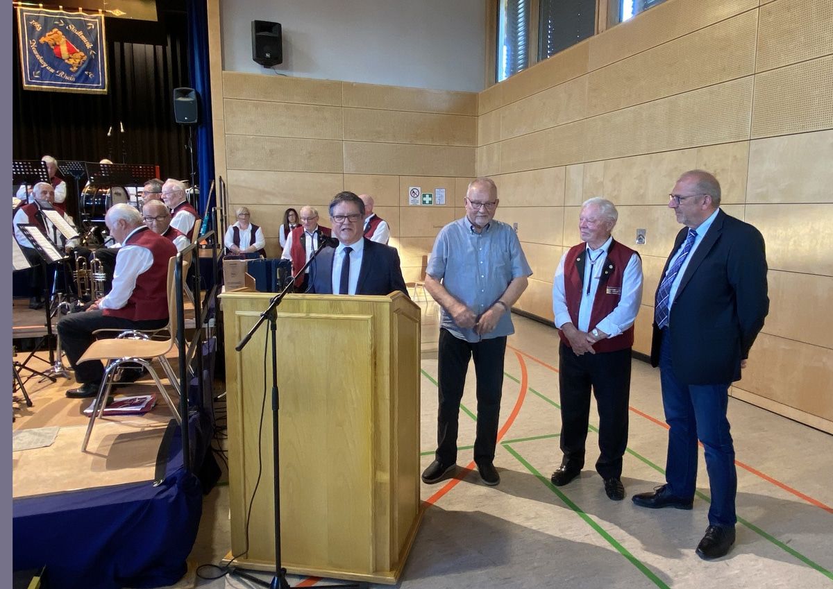 Am Pult Bernhard Metzger - Präsident des Markgräfler Musikverbandes VLnR - Hellmut Blaudszun - Ehrendirigent des MMV , Victor Gutmann - Auszeichnung für 60-jährige musikal. Tätigkeit, Jörg Kitzmann - Geschäftsführer des MMV