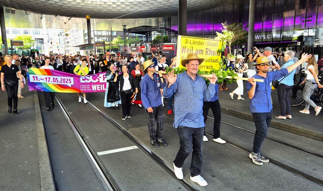 3-Länder-Stadt im Blick: Die Weiler Delegation um Oberbürgermeisterin Diana Stöcker macht bei der ESC-Parade mit und freut sich über die ausgelassene Stimmung in Basel.