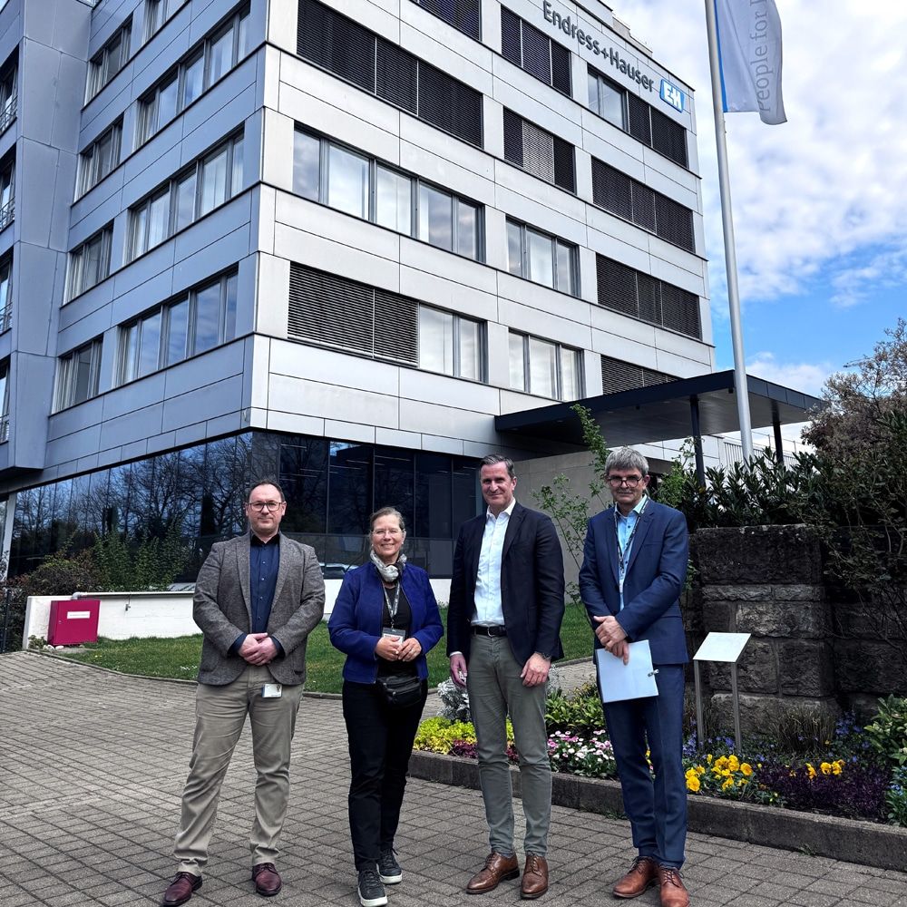 Oliver Twelsiek (2.v.r.), Mitglied der Geschäftsleitung und verantwortlich für den Bereich Business Administration bei Endress+Hauser, sowie Thomas Groß (l.), Abteilungsleiter Facility Management, stellen Oberbürgermeisterin Diana Stöcker und WWT-Geschäftsführer Peter Krause den Weiler Standort im Einzelnen vor und führen die Gäste über das Firmengelände.