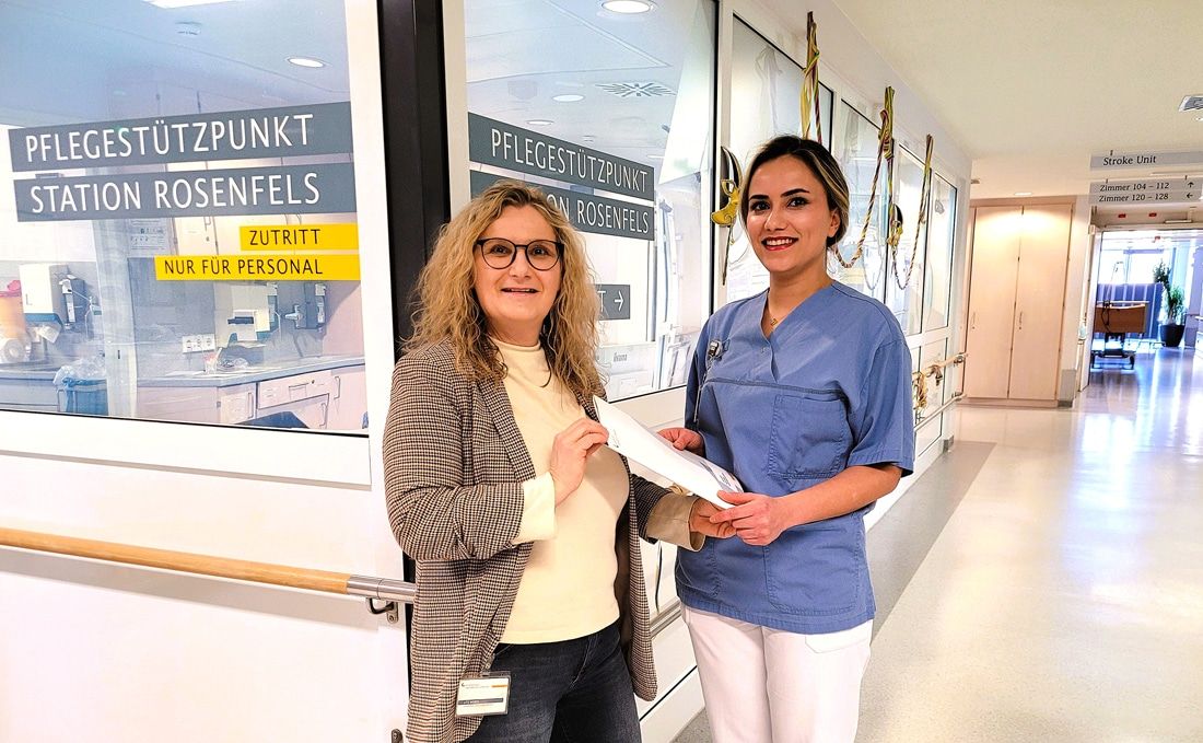 von l. nach r.: Personal-Care Managerin Ute Weber und Pflegefachkraft Melek Örenbasi.