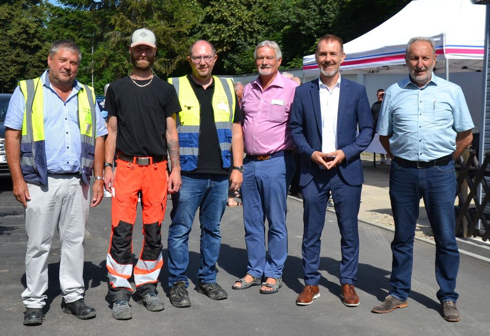 (v.l.n.r.) Rainer Kropf, Planung und Bauüberwachung Eigenbetrieb Abwasserbeseitigung, Daniel Staender, Knobel Bau GmbH, Frank Beuschel, Eigenbetriebsleiter Abwasserbeseitigung, Günter Schlecht, Ortsvorsteher Hauingen, Oberbürgermeister Jörg Lutz, Adolf Himmelsbach, Ingenieurbüro Büro Himmelsbach + Scheurer