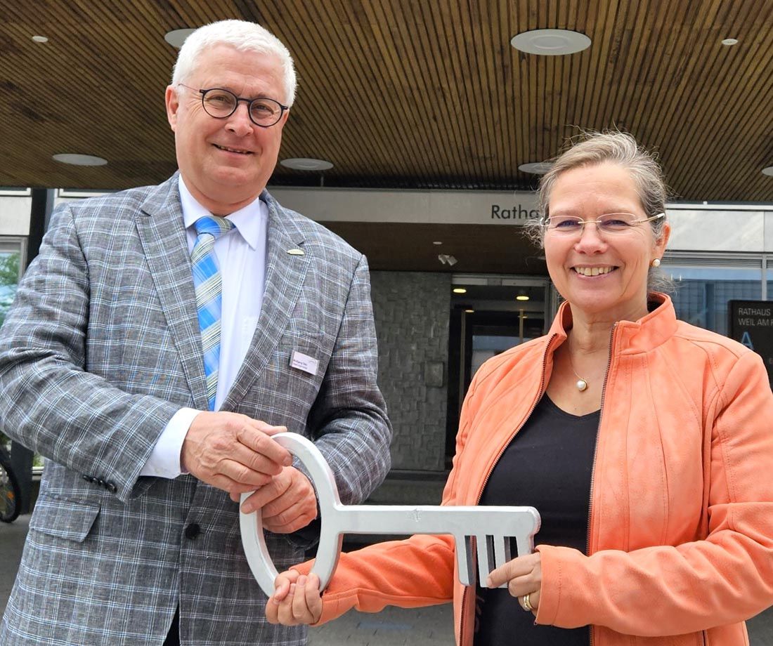 Oberbürgermeister Wolfgang Dietz übergibt nach 24 Jahren den Rathaus-Schlüssel an seine gewählte Nachfolgerin Diana Stöcker, die ab Montag ihr Amt bei der Stadtverwaltung antritt.