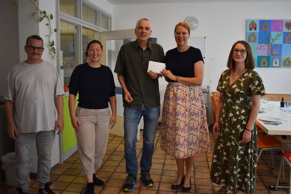 Spendenübergabe im Erich-Reisch-Haus. Personen (v.l.n.r): Ralf Krey, Tülin Sevindik, Stefan Heinz, Bürgermeisterin Monika Neuhöfer-Avdić, Sina Schwander
