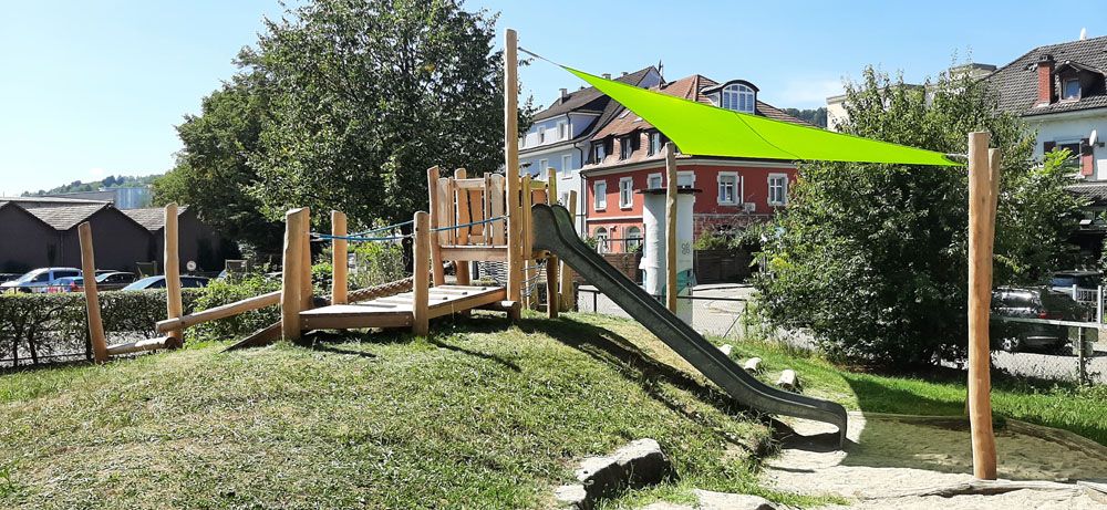 Da die Metallrutsche selbst noch intakt war, wurde diese aus Nachhaltigkeitsgründen wieder in das neue Spielgerät integriert und hat nun zusätzlich eine Verschattung mittels eines Sonnensegels erhalten.