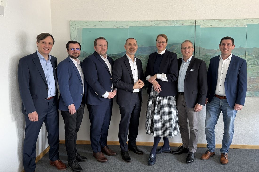 (v.l.n.r.): Jan Kircher, badenova AG; Tobias Kilian, Betriebsleiter Stadtwerke Lörrach; Dirk Sattur, Vorstand badenova AG; Oberbürgermeister Jörg Lutz; Bürgermeisterin Monika Neuhöfer-Avdić; Jochen Debus, badenova AG; Klaus Schallenberger, Betriebsleiter Stadtwerke Lörrach