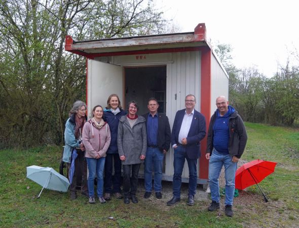 Oberbürgermeister Klaus Eberhardt und Patrick Pauli von der Abteilung Stadtgrün und Umwelt freuten sich, am Dienstag Vertretern des Trinationalen Umweltzentrums (TRUZ) ein neues Materialdepot für die Kurse im…
