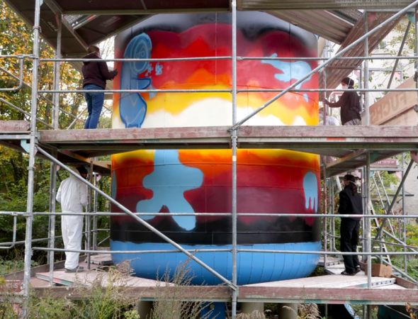 Weil am Rhein. Feuer und Flamme waren Neunt- und Zehntklässlerinnen der Gemeinschaftsschule an einem Samstagvormittag, als sie den Pufferspeicher in der Nähe des Friedlinger Kesselhauses künstlerisch gestaltet…