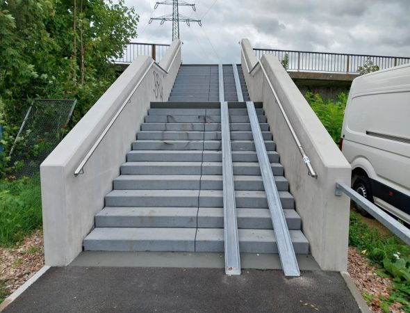 Lörrach. An der Treppenverbindung zwischen der Schwarzwaldstraße und der Gewerbestraße wurden die Treppenstufen beschichtet und die Metallschienen zum Mitführen von Kinderwägen und Fahrrädern installiert. Dami…