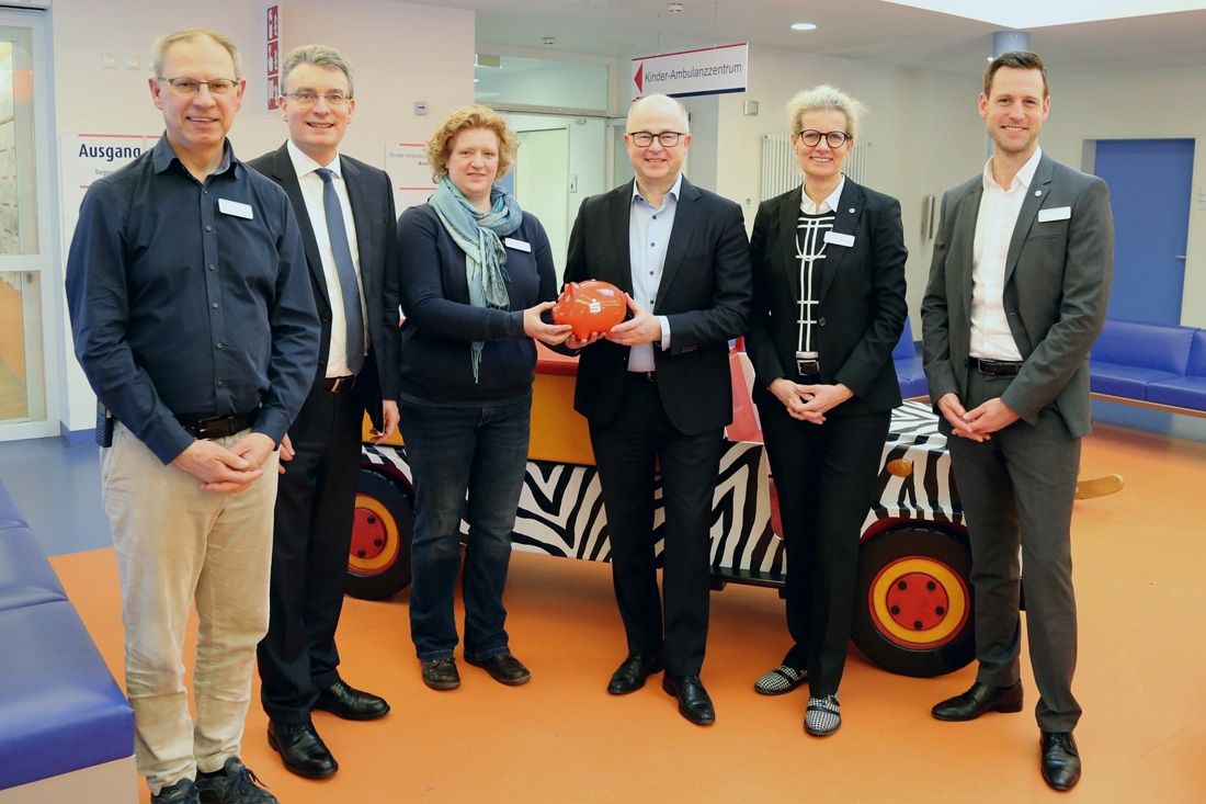 Offizielle Spendenübergabe in der Kinderklinik Ortenau des Ortenau Klinikums in Offenburg: (v.l.n.r.) Professor Dr. Patrick Gerner, Landrat Thorsten Erny, SPZ-Leiterin Dr. Nicola Kuhnke, Vorstandsvorsitzender Jürgen Riexinger, Vorstandsvorsitzende Claudia Bauer-Rabe und Klinikdirektor Mathias Halsinger.