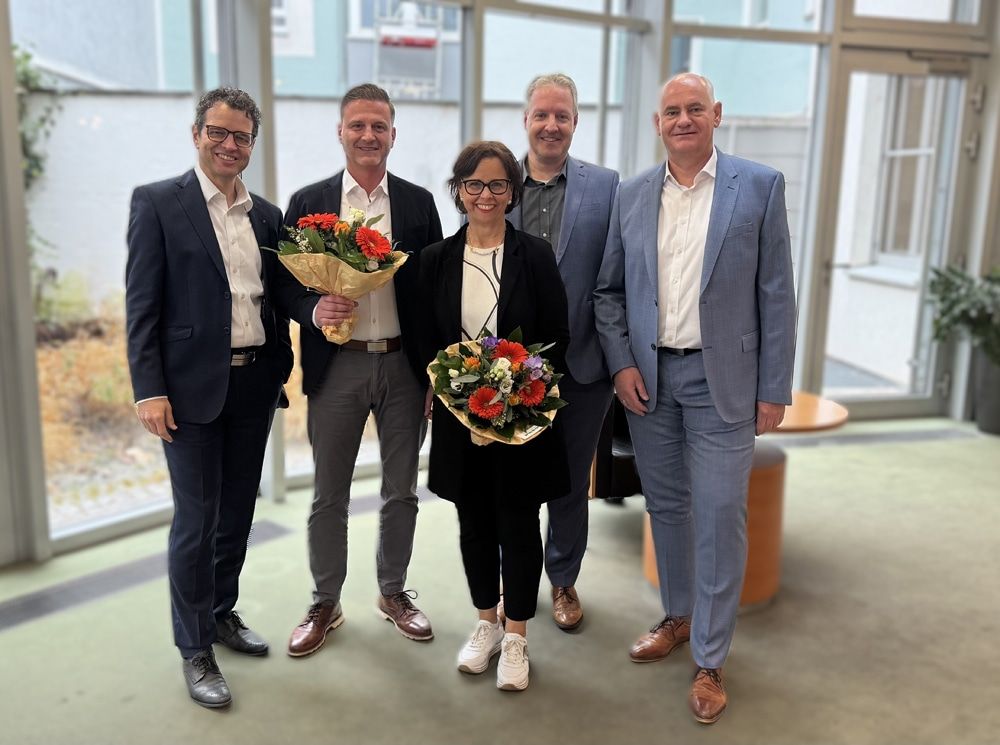 Vorstandsvorsitzender Peter Rottenecker, 25er Jubilar Mathias Galm, die 40iger Jubilarin Heike Maier, Leiter Personalverwaltung Philipp Rösch und Vertriebsvorstand Reiner Richter